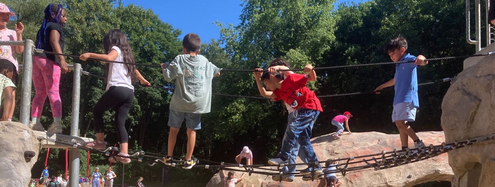 Am 25.06.2025 machten sich die Klassen 1a, 1b und 1c auf den Weg zum Bewegungshügel Vonderort. Dort verbrachten sie bei herrlichstem Sommerwetter einen wundervollen, entspannten Vormittag miteinander. Es wurde gespielt, geschaukelt, mit Becherlupen die Natur erkundet (dabei wurde sogar eine Libelle entdeckt), es wurden Armbänder geknüpft ... und vor allem wurde ganz viel Sport gemacht. Dazwischen gab es immer wieder Zeit für ein ausgiebiges leckeres Picknick auf den mitgebrachten Decken und Handtüchern. Zum Schluss ging es noch zum benachbarten Platz mit den Kletterwänden, wo viele Kinder Mut und Kraft bewiesen und die Wände erfolgreich erklimmen konnten. Andere zeigten ihre große Sprungkraft auf den Trampolinen, während wieder andere auf den Balancierstämmen ihren Gleichgewichtssinn erprobten. Ansonsten wurde im Sand gespielt oder einfach im Schatten ausgeruht und weiter gepicknickt. Alle hatten viel Spaß miteinander, waren nach dem Rückweg in praller Sonne k.o., aber sich einig: So einen Ausflug können wir gerne bald wieder machen!