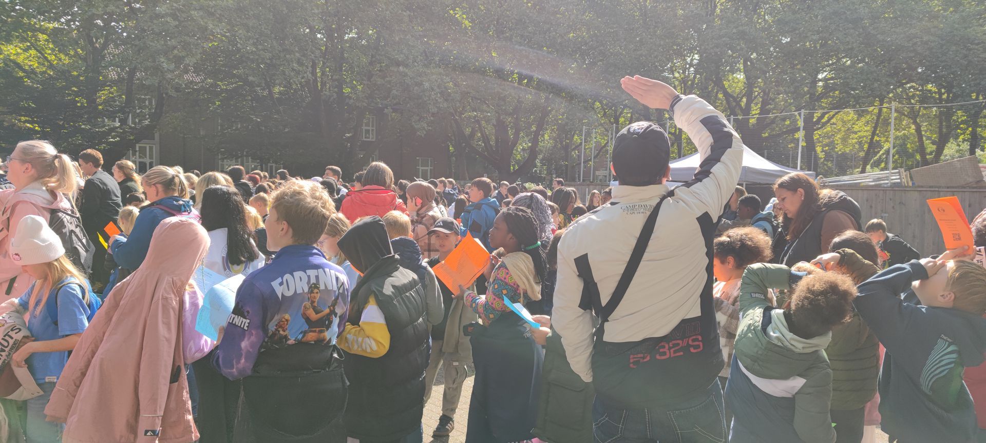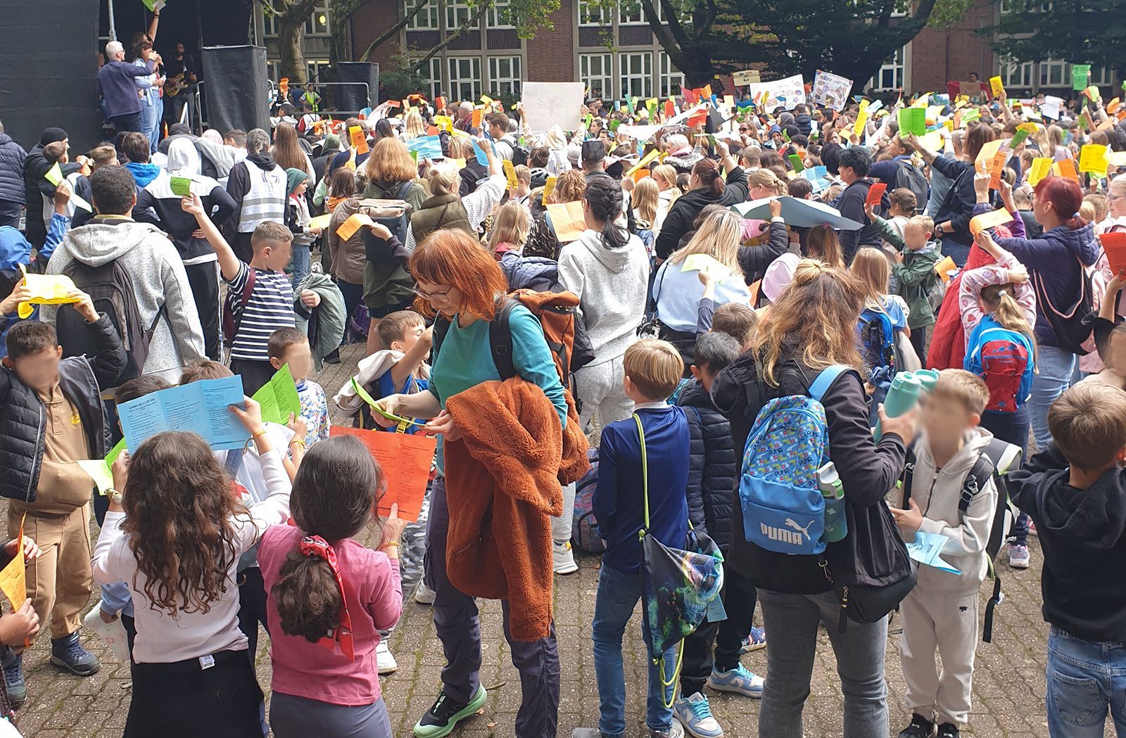 Bereits am Morgen brachen wir zur Gesamtschule Osterfeld auf und wurden dort herzlichst willkommen geheißen. Es gab verschiedene Mitmach-Stationen für die Grundschulkinder zum kreativen Gestalten, Bewegungsangebote und Spiele zur Förderung der Teamfähigkeit. Zum Abschluss versammelten sich alle Kinder zur Kundgebung an der Bühne und sangen gemeinsam die Lieder "Wir sind alle Kinder dieser Welt" und "Friedensbrücken der Welt".