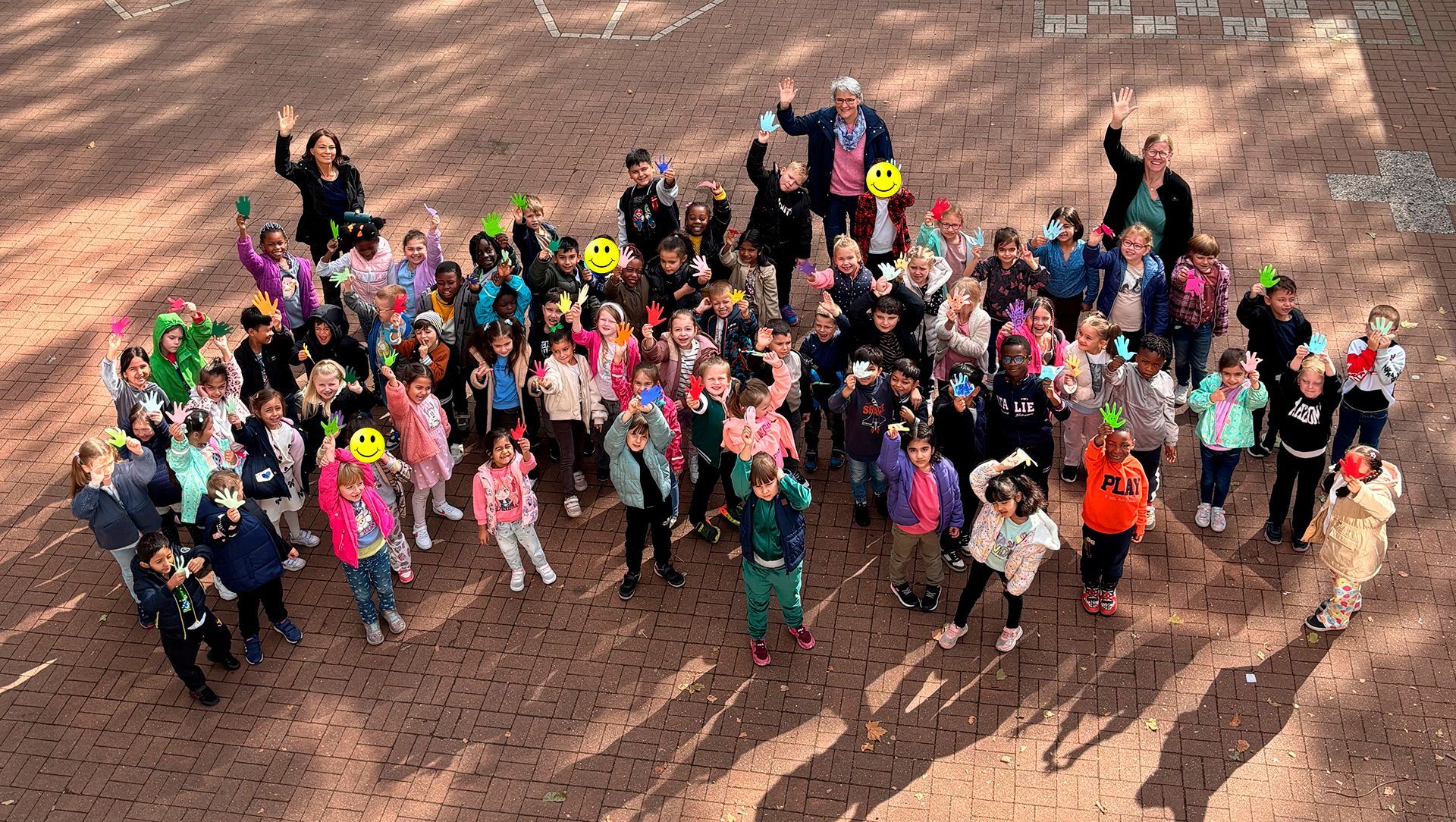Aber auch unsere Erstklässler, die am Freitag an der Erich Kästner-Schule geblieben sind, haben aktiv zum Thema Vielfalt gearbeitet. Unter dem Motto "Wir sind alle bunt und halten fest zusammen" haben die Kinder unter anderem bunte Handabdrücke gebastelt und ein gemeinsames Foto auf dem Schulhof gemacht.