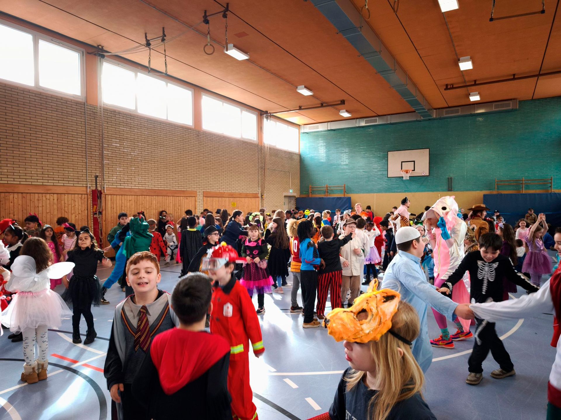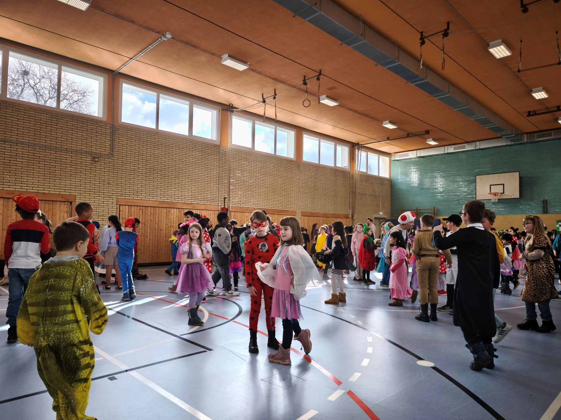 Ein Höhepunkt des Tages war die traditionelle Polonäse, die alle Kinder singend und lachend durch das Schulgebäude und über den Schulhof führte. In einer langen, farbenfrohen Schlange zog die Schulgemeinschaft zur Turnhalle, wo das närrische Programm seinen Lauf nahm.