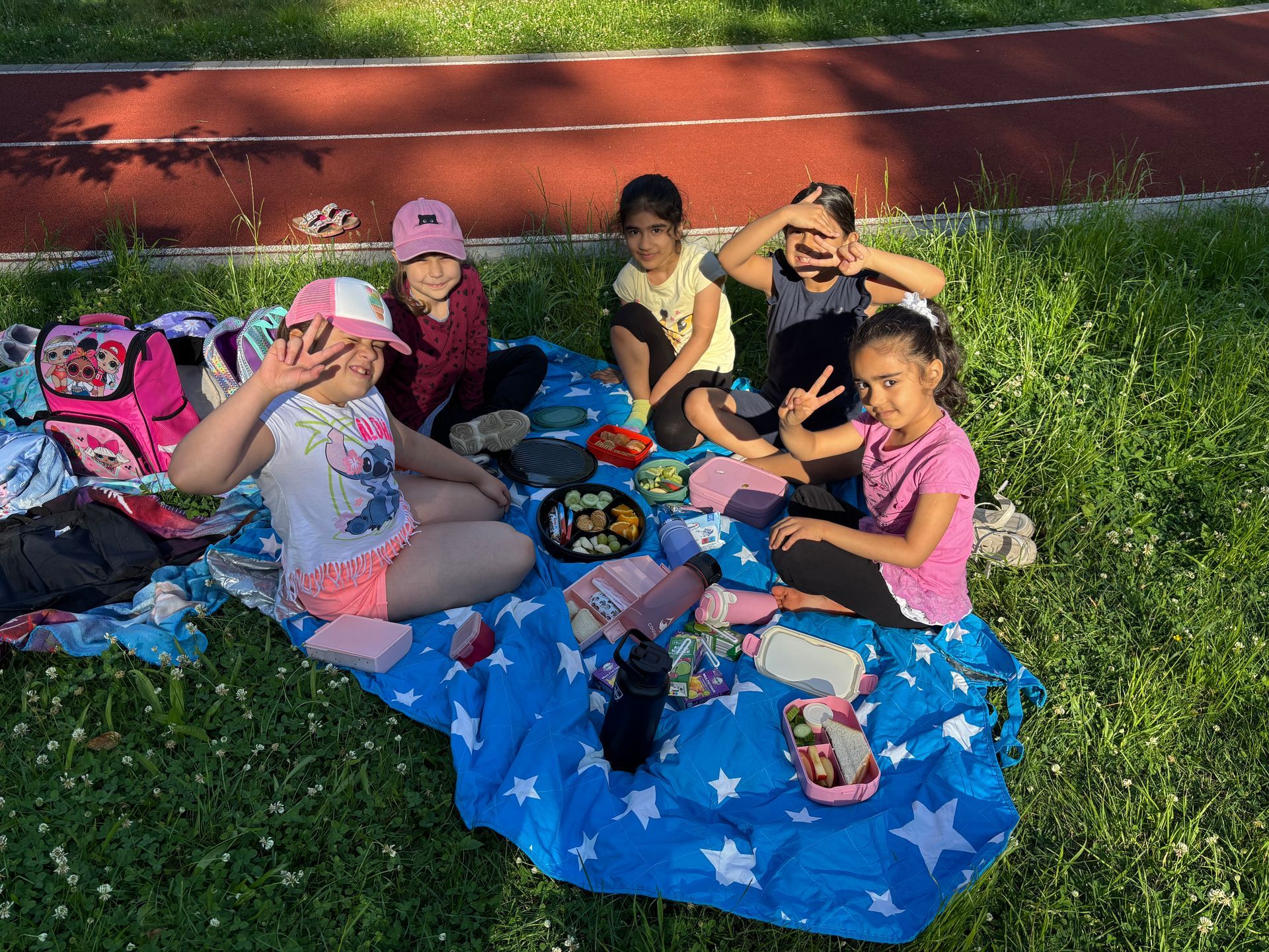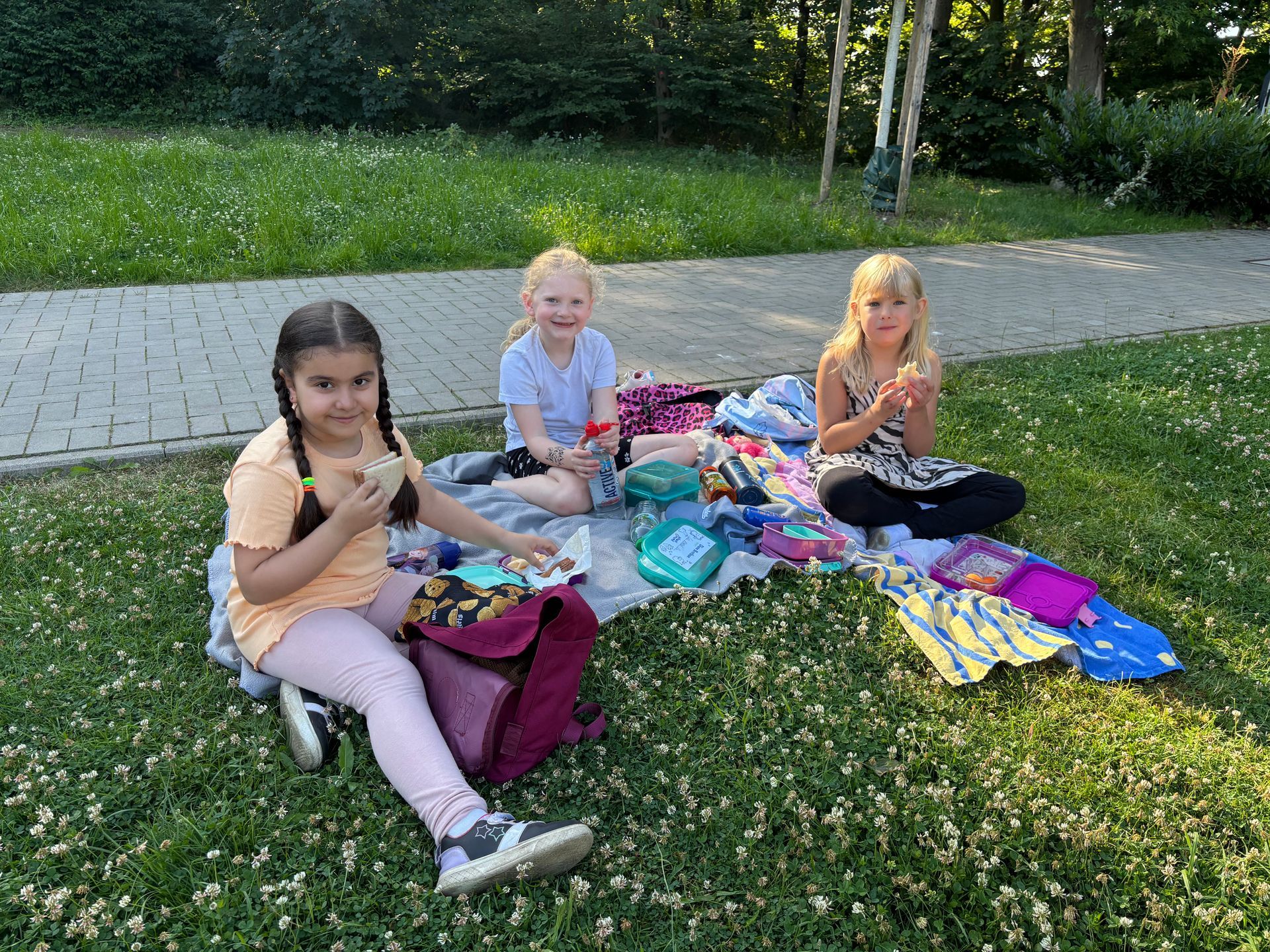 Es wurde gespielt, geschaukelt, mit Becherlupen die Natur erkundet (dabei wurde sogar eine Libelle entdeckt), es wurden Armbänder geknüpft... und vor allem wurde ganz viel Sport gemacht. Dazwischen gab es immer wieder Zeit für ein ausgiebiges leckeres Picknick auf den mitgebrachten Decken und Handtüchern.
