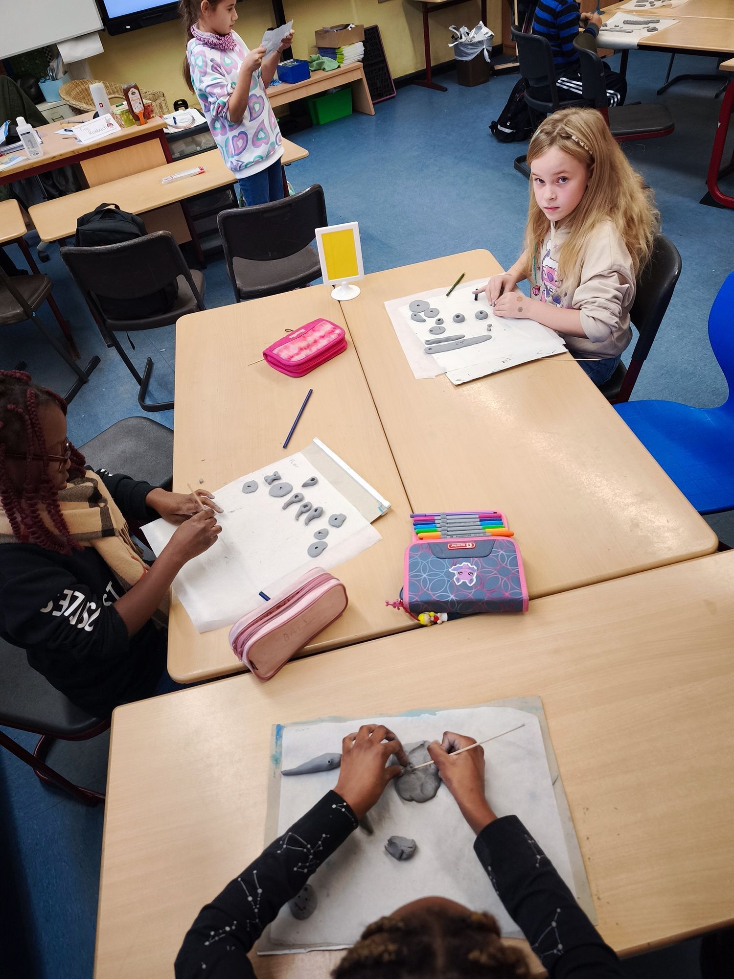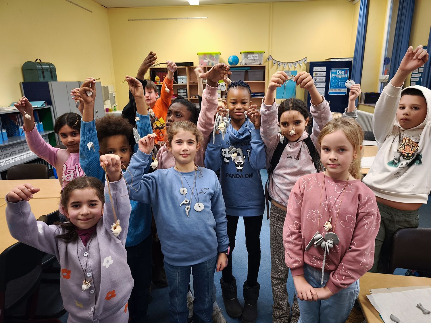 Vor allem das Mammut mit seiner enormen Größe und den riesigen Stoßzähnen war sehr beeindruckend. Der Ausflug war der Höhepunkt unserer Zeitreise in die Steinzeit. Wir hatten uns in den vergangenen Stunden schon interessiert und produktiv mit dieser Zeit auseinander gesetzt und u.a. Steinzeitschmuck gebastelt und uns in der Höhlenmalerei probiert.